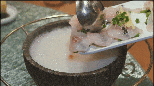 鱼片石窝粥作为福临轩的“暖胃王牌”,是用加热到300度高温的石锅一下子把鱼片烫熟,细滑绵密的粥底加上新鲜的皖鱼片,再撒上一点点葱花和油,一碗下肚真的好舒服。