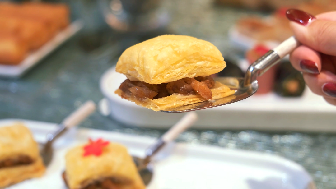 广州酒家原创脆皮梅子叉烧包,在外型上就颠覆了传统叉烧包的印象,巧克力外皮再撒上一层白白的糖霜,酸甜的梅子酱混合咸香的叉烧,尝起来酸甜咸口,味道层次丰富。
