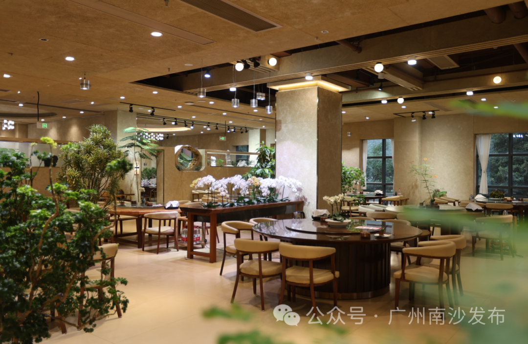 广州酒家南沙城分店设有大厅、宴会厅、包房、露台休息区等多个区域,装潢色调以金色、蓝色和黑色为主,整体风格古典雅致。