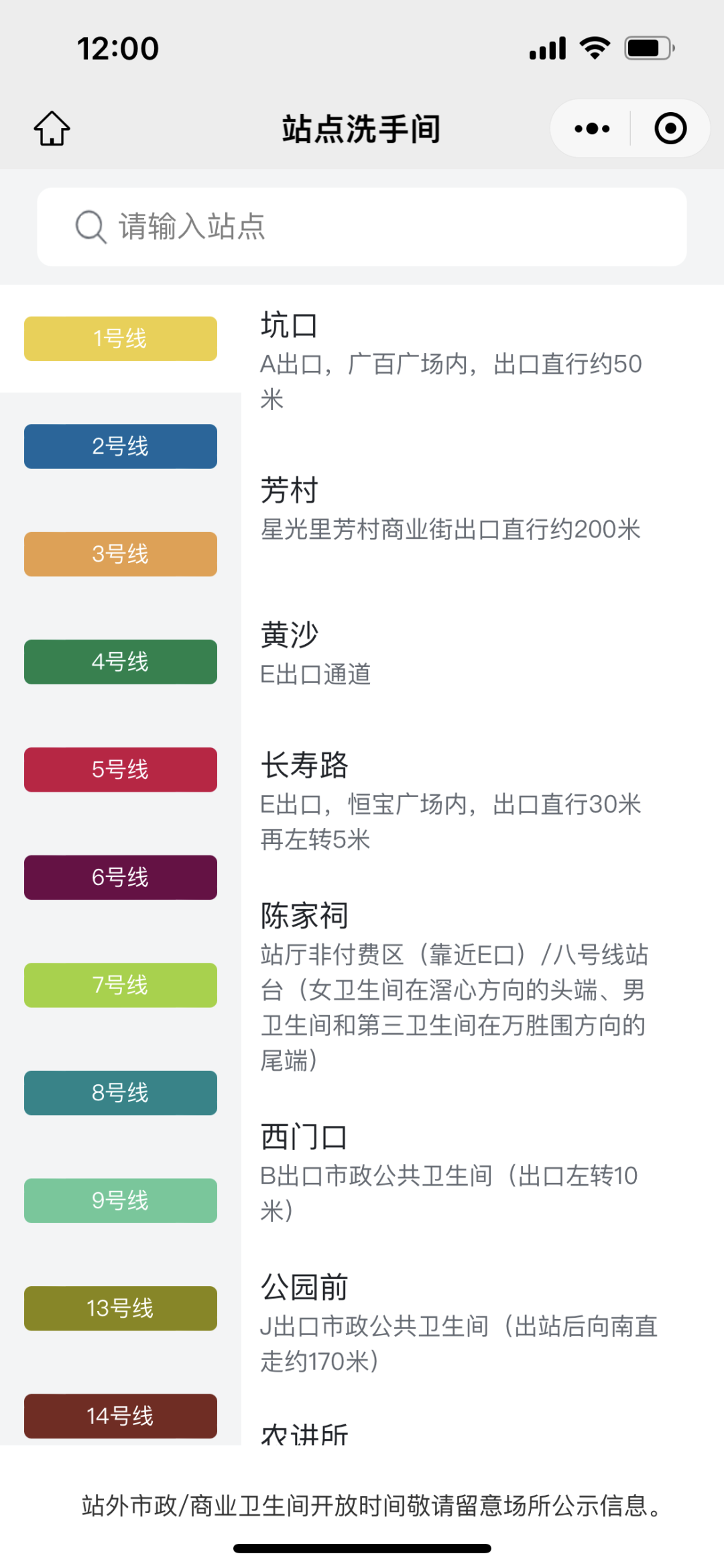 记者尝试扫码后,看到“站点洗手间”界面上显示有广州地铁线网各线路、海珠有轨线路以及佛山地铁二、三号线及南海有轨电车一号线共20条线路的站点信息,点击相应线路可看到对应站点下关于站内或车站就近公共卫生间的提示。比如:一号线坑口站提示“A出口,广百广场内,出口直行约50米”,说明该站厕所在车站A口外步行约50米的广百广场内;而五号线员村站提示“二十一号线站台,增城广场方向的尾端”,则表示该站厕所设在二十一号线站台往增城广场方向的尾端处。