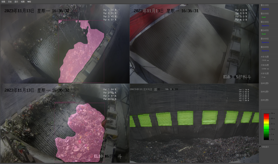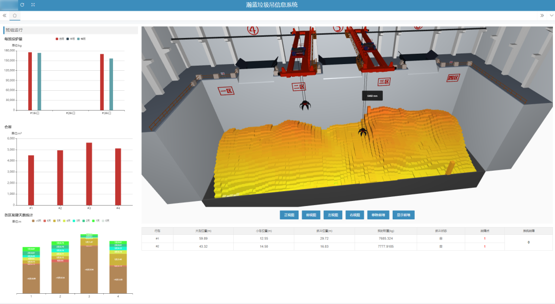 目前,该项技术已成功应用于瀚蓝南海固废处理环保产业园。在正常运行工况条件下,垃圾吊自动化系统投用率达到90%以上,垃圾吊自动化水平已达到行业领先水平:具备自动混料功能,提升不同种类垃圾的供料均匀性,垃圾掺配功能及效果较好;实现抓斗在运动过程主动避障、柔性着床、减少过载,提升垃圾吊的稳定性和安全性;通过图像识别卸料门的开关情况,结合卸料门的限位信号做联锁控制,双保险规避作业风险;通过垃圾仓智能管理平台的垃圾堆放管理功能,记录各区域垃圾的进料时间、堆放时间、发酵时间等信息,为投炉垃圾提供热值数据参考。