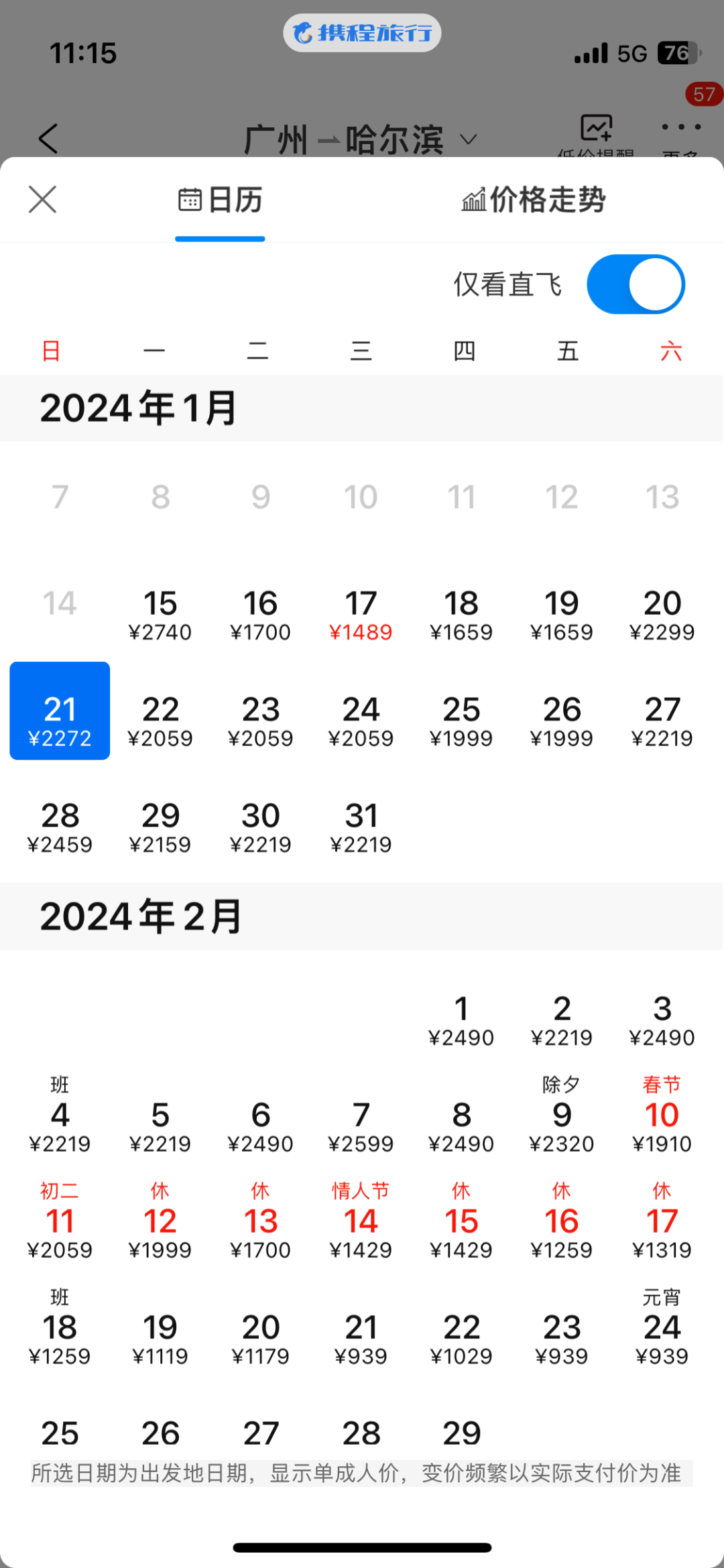 哈尔滨旅游持续爆款,机票一票难求,同时价格水涨船高。记者查询发现,近期广州直飞哈尔滨,在2月12日前,含税后价格多数日期都已超过2000元。