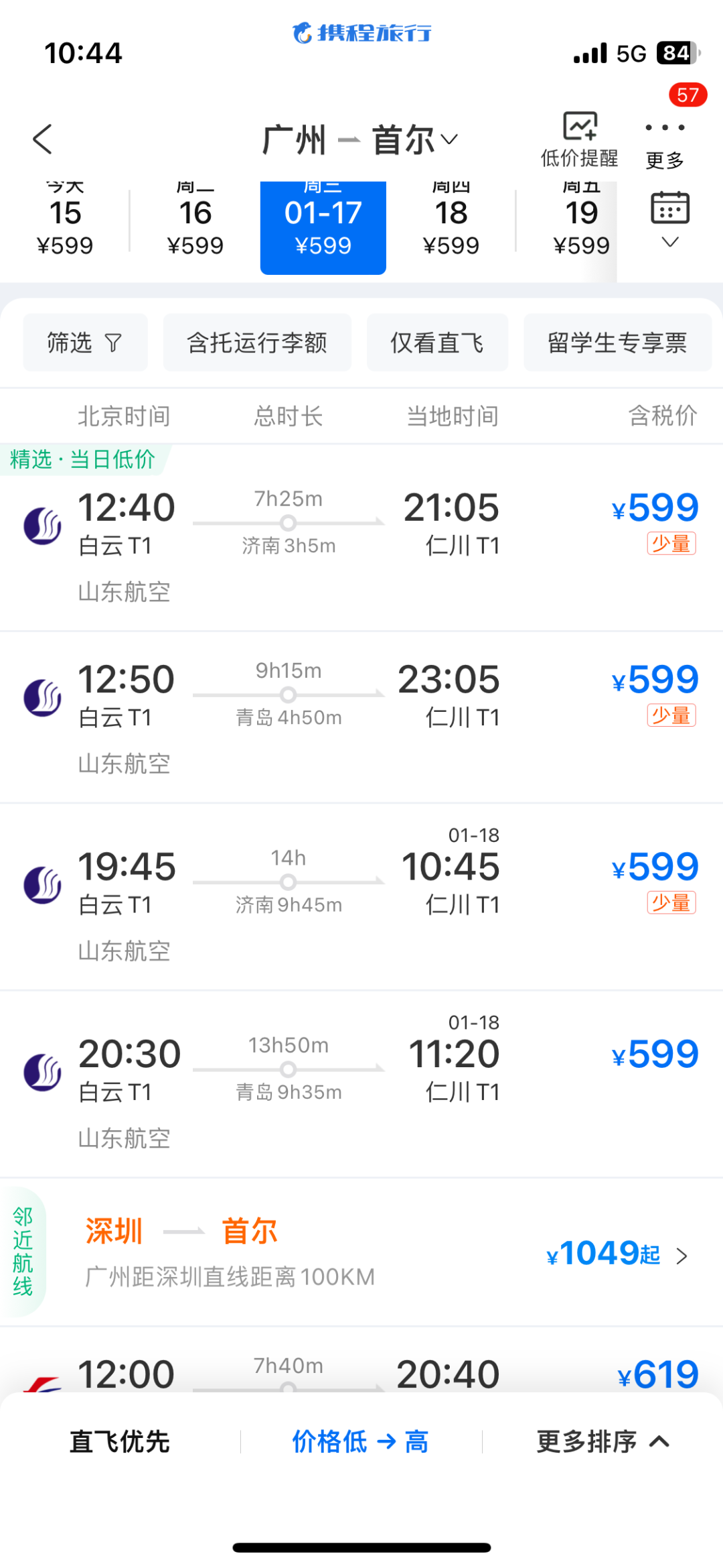 不过,记者发现,近期广州前往日韩及东南亚的机票价格十分优惠。记者查询携程发现,以出发日期为1月17日的航班为例,从广州出发,如果搭乘山东航空在济南中转,含税最低参考价格仅需599元;市民还选择搭乘东方航空在青岛中转,含税最低参考价格仅需619元;如果选择直飞,含税后最低参考价格也只要1219元。