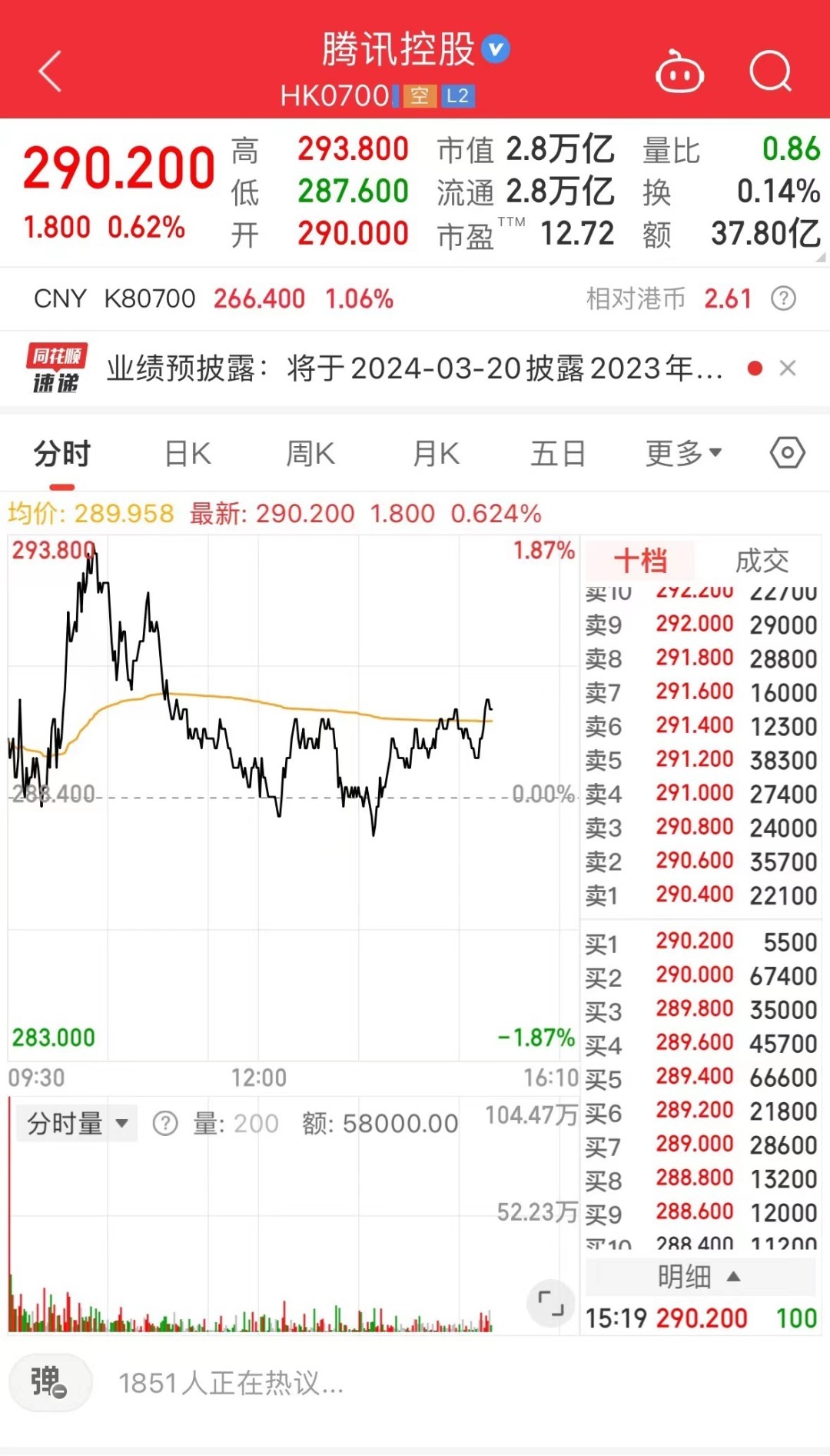 1月15日,上周末王者荣耀与抖音握手“言和”,受消息影响,当日腾讯控股股价上涨,至截稿时,腾讯股价涨0.62%,报290.20港元/股,市值2.8万亿港元。近日,机构公布评级,对腾讯控股给予买入评级。1月15日,花旗研究报告称,维持腾讯控股“买入”评级,目标价497港元。1月9日,中信证券给予腾讯控股买入评级,目标价468.00港元。