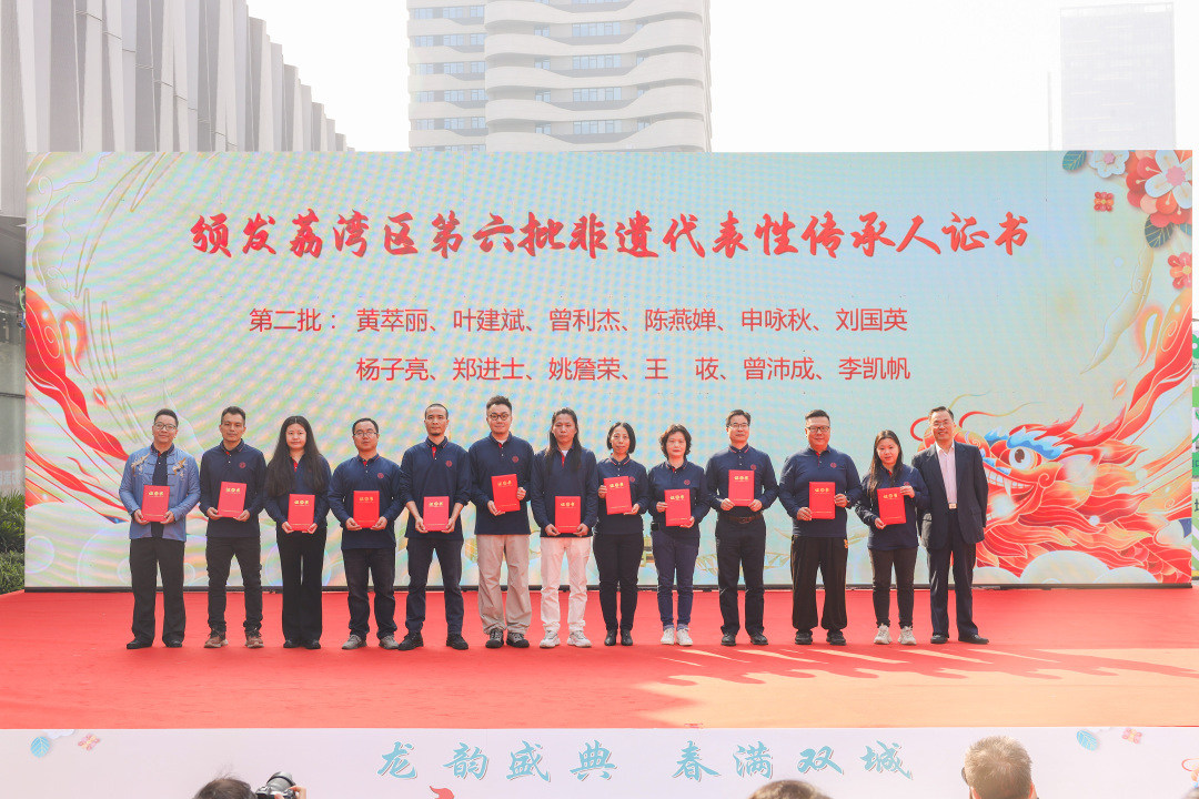 启动仪式上还举行了荔湾区、南海区非遗传承人颁证仪式,分别为荔湾区第六批区级、南海区第五批区级代表性传承人共计47人(荔湾区24人、南海区23人)颁发了证书。