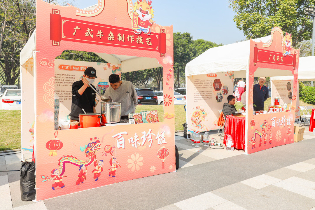 当天,花地湾生活馆外的非遗集市热闹开锣。百味珍馐体验区、巧匠天工展示区、济世“五味”中医药义诊区、百年薪传老字号展示区四个区域,共设置40个广佛非遗展位,传承人现场进行技艺展示、讲解,馆内的精品展览共邀请了八个荔湾区代表性非遗项目,展示了大师们的精品力作。市民不仅可以近距离了解非遗的魅力,还能边逛边吃边买,品尝非遗美食、购买非遗手信。