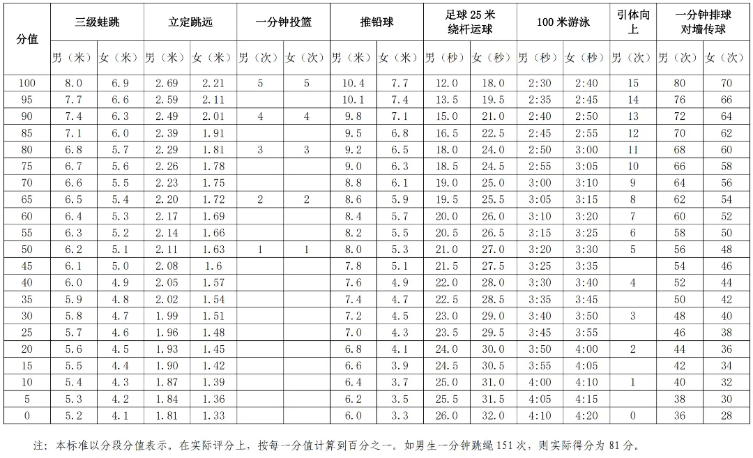 《国标》成绩:2024 年初中毕业生,初一、初二、初三年级《国标》测试成绩各占2分,各学年《国标》测试成绩及格者满分2分,不及格1分。