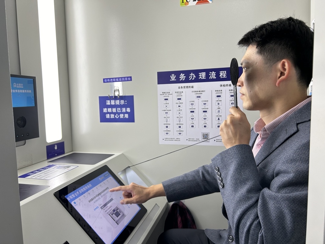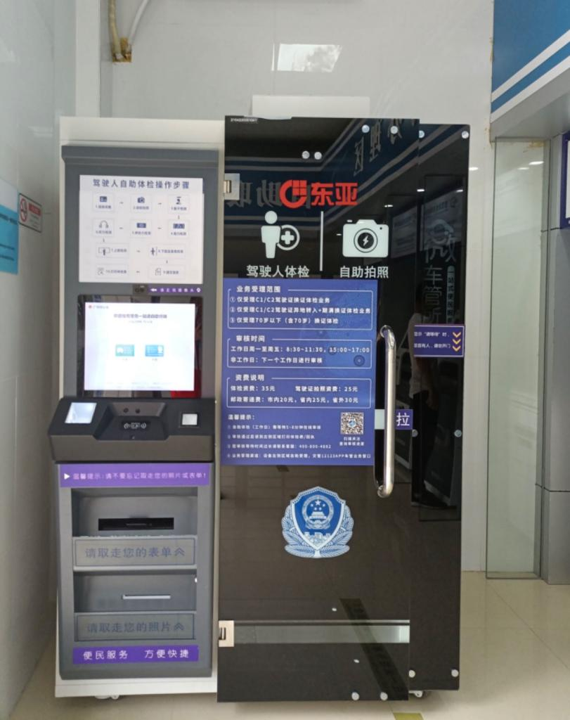 据介绍,“一体机”融合了户政、车管、体检、拍照等多种业务,群众根据设备语音及屏幕上的提示,就可以自助办理业务,实现一站式办理。如体检方面,“一体机”可以全流程办理驾驶员体检业务,办事市民只需刷身份证,就能完成视力、身高、四肢以及听力等多项检查,再到业务窗口办理驾驶证期满换证业务,全程办理时长不超过5分钟。市民使用“一体机”完成体检后,数据将直接录入车管所的业务系统,无需打印纸质证明递交到窗口,现场使用“交管12123”手机APP,就可申请办理初次申领驾驶证和期满换证业务。