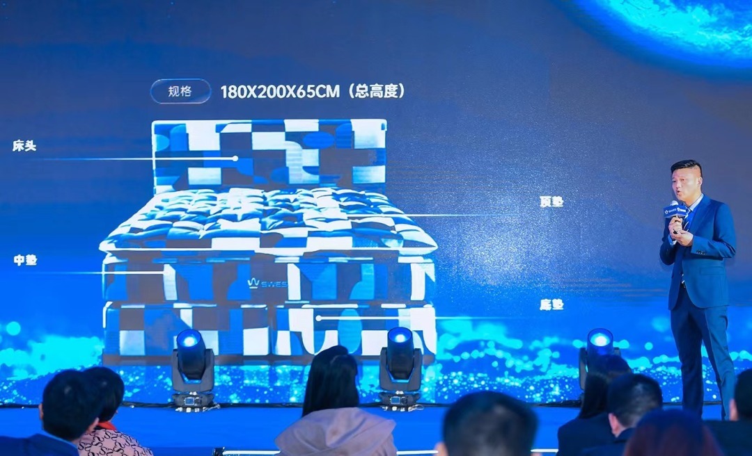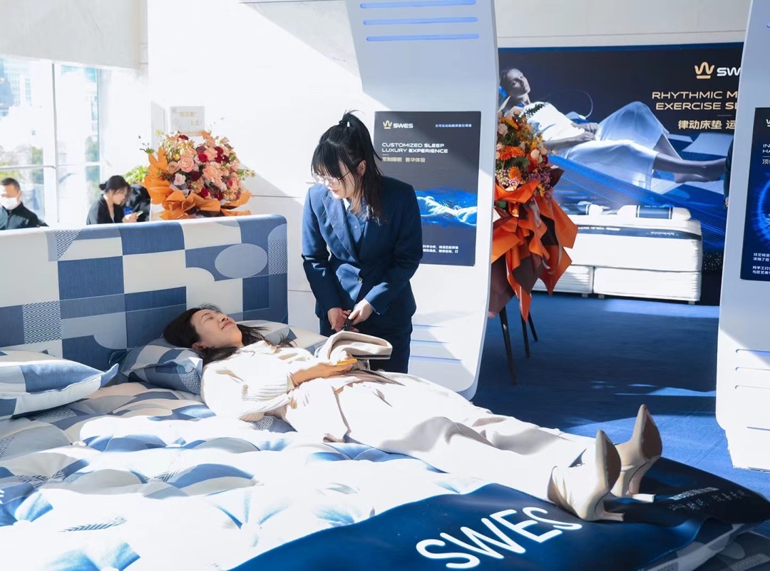 “SWES在接近人体腰部、腿部位置设置2个律动器。当启动律动模式时,平躺床垫上,双手自然放平,有节奏的律动分别从腰部、腿部有序震动,且频率均匀,放松状态从腰部、腿部慢慢扩展至全身。当全身处于最佳解压状态时,即可进入深度睡眠期。”在发布会现场的体验区内,专业讲解员告诉记者,当启动睡眠模式时,床垫完全静音,依据人体工程学给予身体贴合的支撑,让人慢慢进入舒适的睡眠状态。