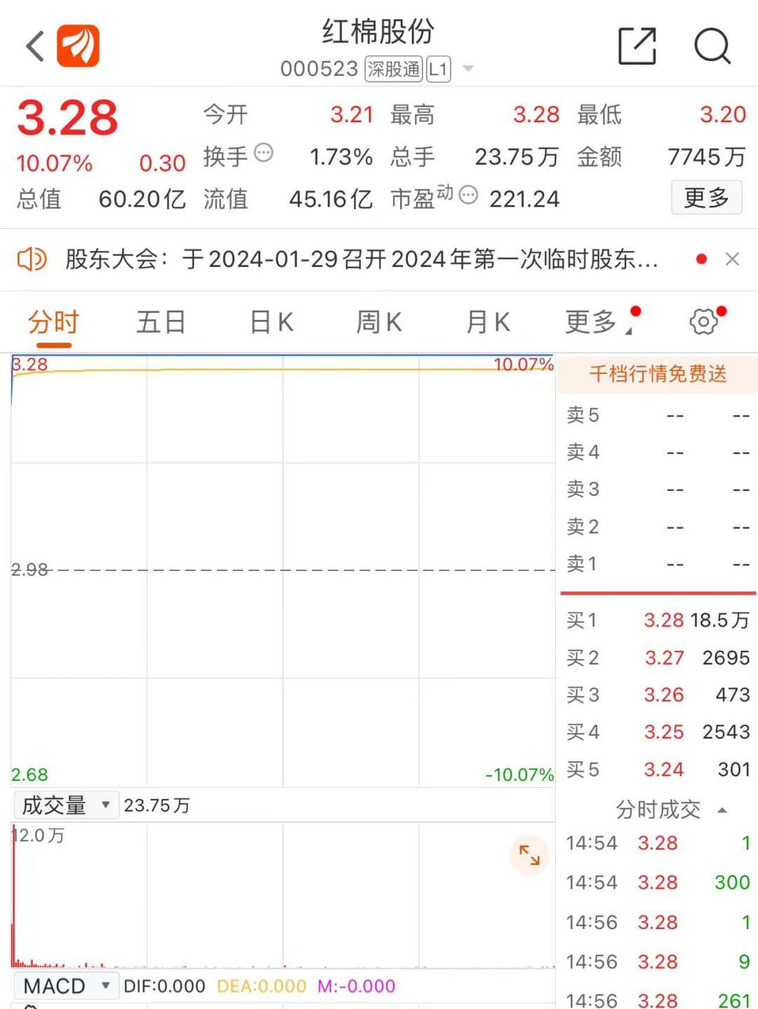 1月15日,红棉股份开盘不久后涨停。截至当日收盘,红棉股份报收3.28元/股,上涨10.07%。上周五,红棉股份曾公告称,拟由公司通过现金方式购买轻工集团全资子公司广州鹰金钱食品集团有限公司(下称“鹰金钱”)100%股权。