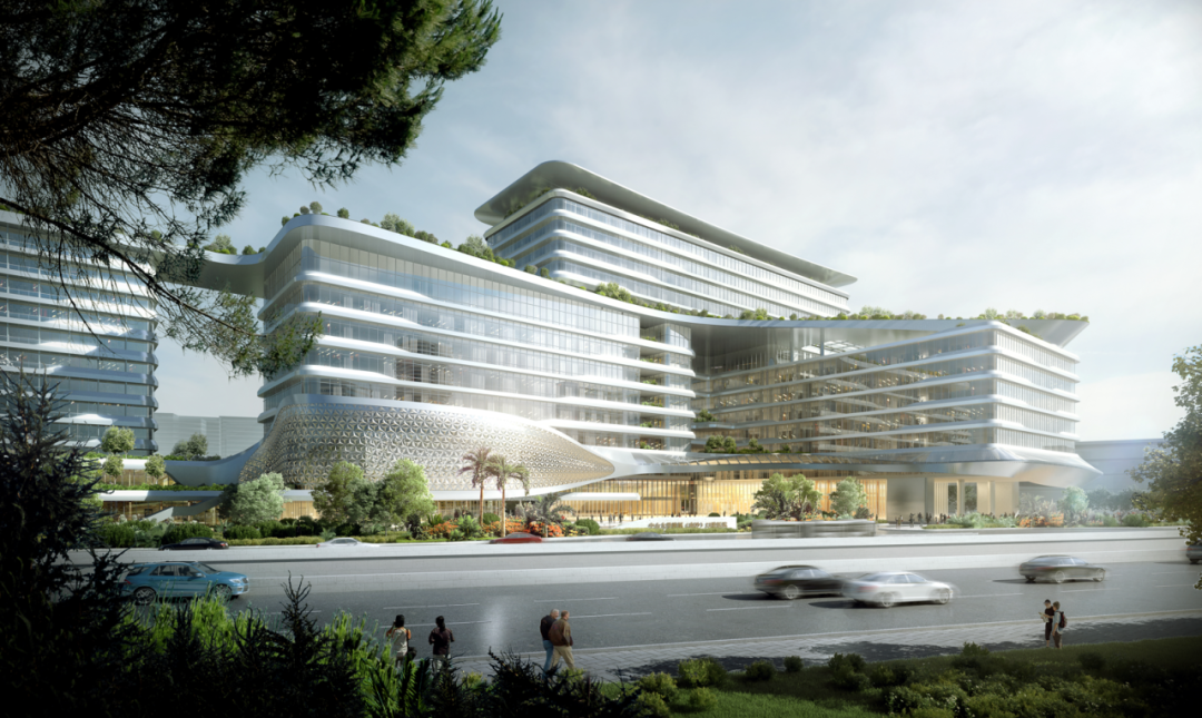 该医院科学布局,突破传统,建筑体块采用L型布局,形成医疗区、科学教研区及行政办公区、生活服务区三大主要功能体块,医疗区设置于项目东侧,方便公众进出;生活服务区位于相对安静的西侧;科学教研区及行政办公区则位于中部,与两侧功能区紧密联系,垂直交通和空中连廊的设计,为各功能区高效、紧密沟通提供助力。