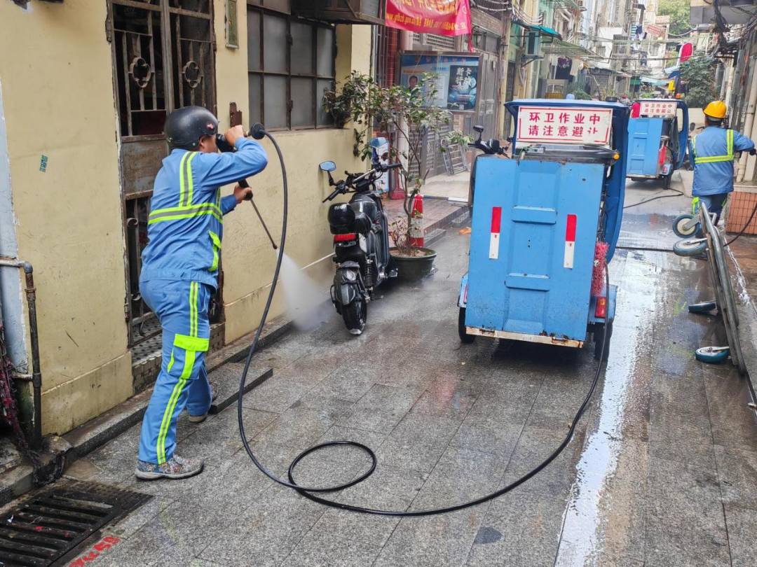 行动中共出动4台高压清洗车辆,对辖内街巷进行“三清”,即清洗内街巷路面、清理卫生死角、清除空飘垃圾。清洗范围覆盖背街小巷、居民小区、门店前坪等地段,采用“人机协同”配合的作业模式,对路面、绿植沟渠和垃圾分类设施等处进行进行全面冲洗和湿扫作业,加大对路面积泥、沙石、污渍的清洁力度,同时针对道路边角等车辆无法作业的路段采用人工冲刷清扫的方式,彻底消除卫生死角,还原道路路面本色、沟渠底色。环卫作业人员还对墙面、护栏等乱张贴的“牛皮癣”小广告进行铲除清理,让小广告无“容身之地”,着力提升城市整体形象,为市民群众提供干净整洁优美的人居环境。