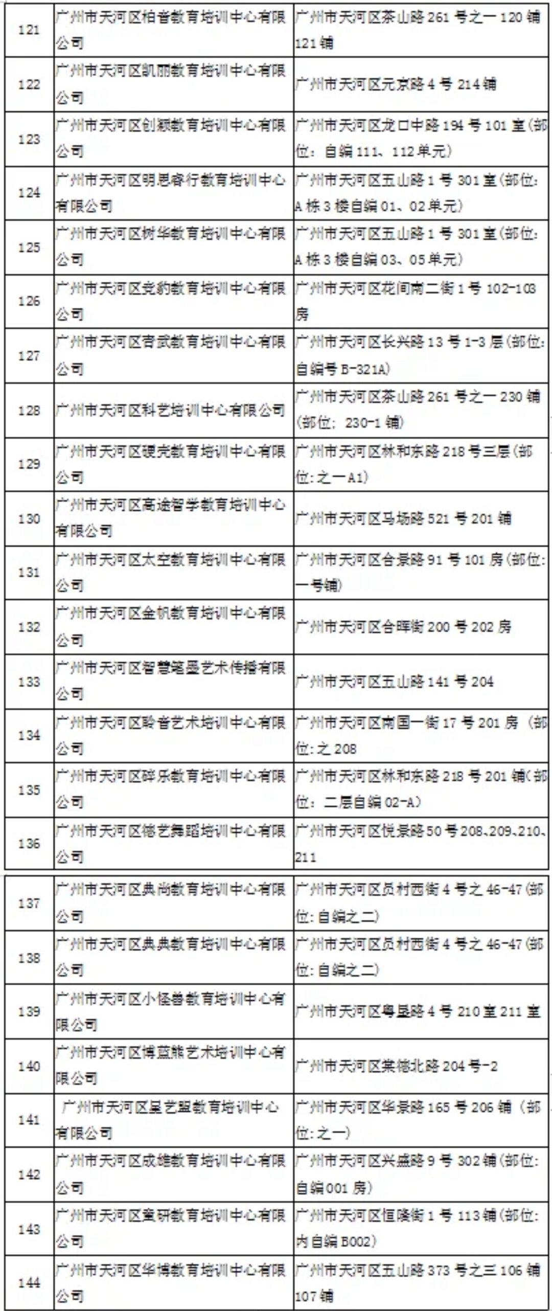 2024年1月15日,广州市天河区教育局官方公众号发布《天河区公布持证校外教育培训机构名单》,公布了天河区证照齐全的校外培训机构名单,共包含144家培训机构(数据更新至2023年12月31日)。