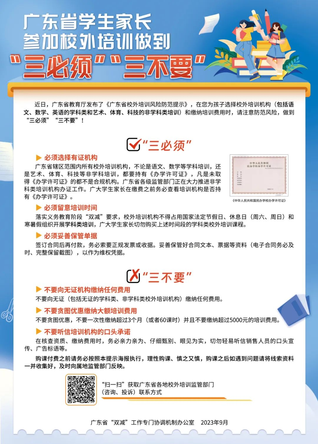 天河区教育局表示,天河区将对名单实行动态管理、不定期更新。家长如需为孩子报读校外培训机构,请选择持证机构,并做到“三必须”和“三不要”。即必须选择有证机构、必须留意培训时间、必须妥善保管单据,不要向无证机构缴纳任何费用、不要贪图优惠缴纳大额培训费用、不要听信培训机构的口头承诺。
