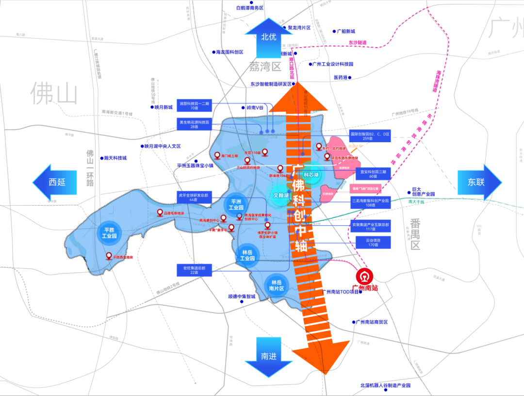 近日,经区政府批准,“港口路”与“岗东路”正式合并更名为“科创大道”。科创大道既是“一轴”之一,也是“两翼”产业集群间的交通要道。往北,将无缝链接海龙围科创区、白鹅潭商务区,并通过东沙隧道、鹤洞大桥、洲头咀隧道,与海珠、越秀快速连通。使润慧科技园、美生桃花源等科创载体将与广州的科创区、商务区形成错位互补。往南,将连通林岳南板块约440亩先进信息装备智造产业社区,以及广东工业设计城、三龙湾机器人谷,打通佛山市内科创研发、工业设计、装备智造联动的“血管经脉”。往东,以科芯湖为核心,以尼得科、南华仪器、安齿生物等科创企业总部为龙头,以产业载体为支撑。未来将撬动约2000亩的番禺飞地,通过番海大桥、海怡大桥,与长江路东延,深入对接广州腹地,形成广州策源、三山苗圃、周边协同的创新环境,打造广佛科创合作示范区。往西,以文翰湖科创特色小镇为核心,以季华实验室为引擎,带动8000多亩的平洲、平南、平胜三大工业园蝶变升级,形成高端智造产业带。