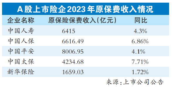 1月16日晚间,中国太保公告,2023年1月1日至2023年12月31日期间,该公司合计实现原保险业务收入约4234.68亿元,同比增长约7.71%。至此,A股上市五大保险公司2023年原保险保费收入数据已悉数披露完毕。