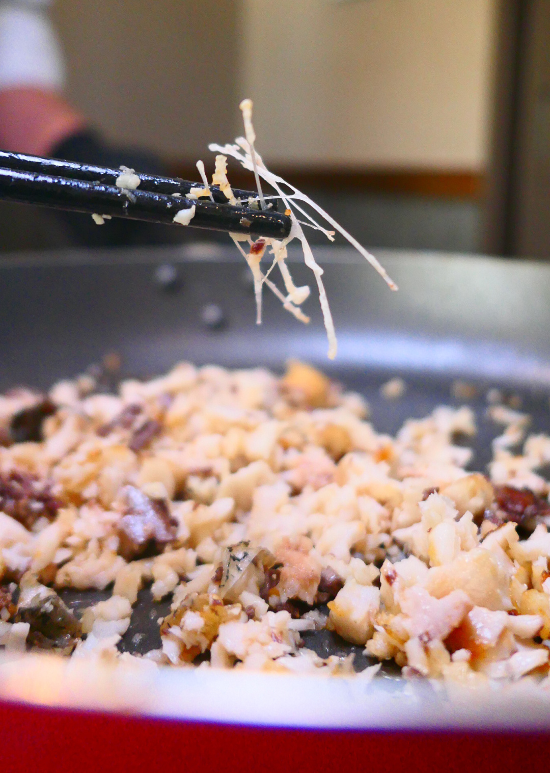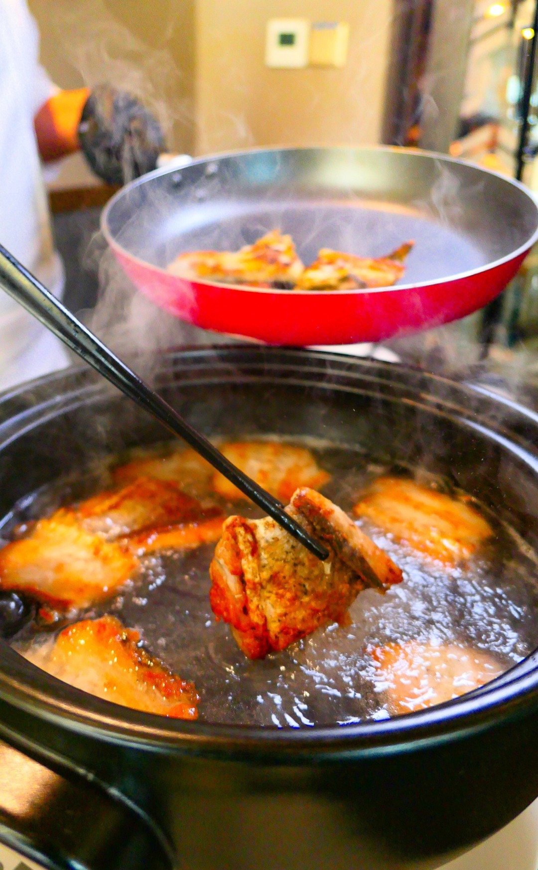 接下来,就是对其精细分解——大厨先将新鲜的大头鱼对半剖开,只选取肉质最肥美的鱼腩用于拆肉去骨。随后,大厨将鱼腩煎至表面微微金黄后,用筷子把鱼肉轻轻挑碎,找到其中的细小鱼刺,一根不落地挑拣出来。“这一步骤至少需要重复三次,保证鱼刺都被挑拣出来。这些工序必须由人工操作,机器无法替代。因此,拆鱼羹是名副其实的‘手工菜’。”钟伟说。