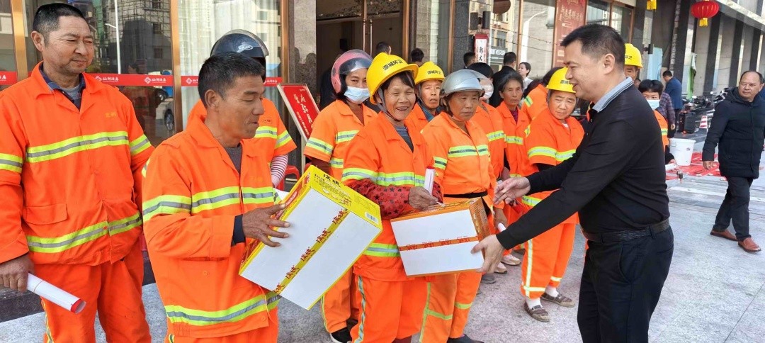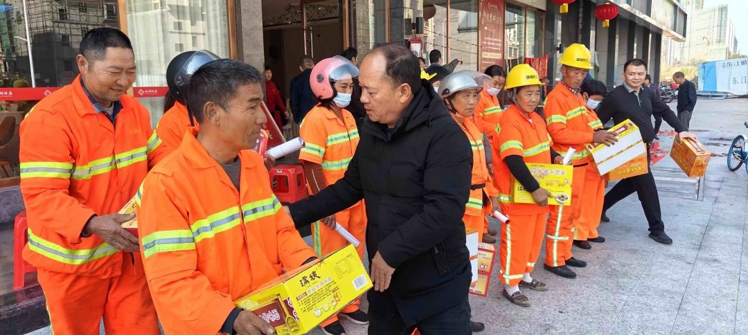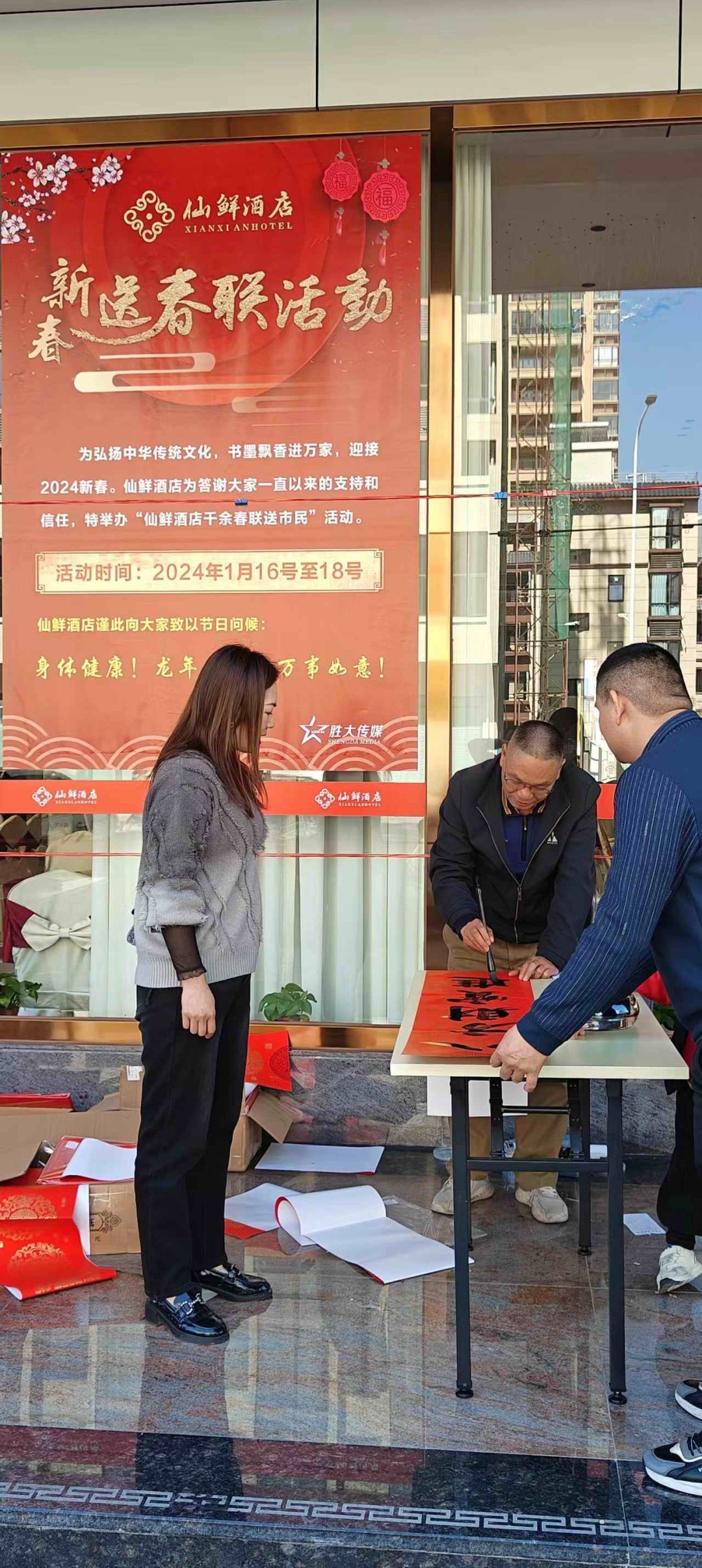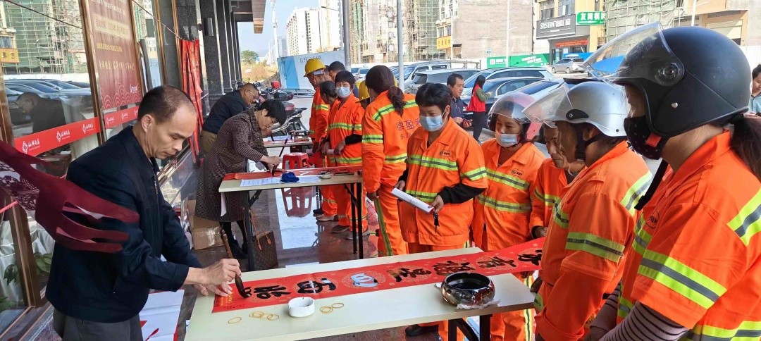 1月16日上午,河源市区知名爱心企业家、仙鲜酒店老板罗燕强专门购买了1300副空白春联,同时组织邀请了郭振强、肖志远、邓葵花等多名书法爱好者或书法家,率先在河源市区永盛路与东江西路交汇处的街头义写春联,并将义写的春联免费送给当地环卫工人和河源市民,该餐饮企业当天还为附近街道的数十名环卫工人赠送了米、面等慰问品。