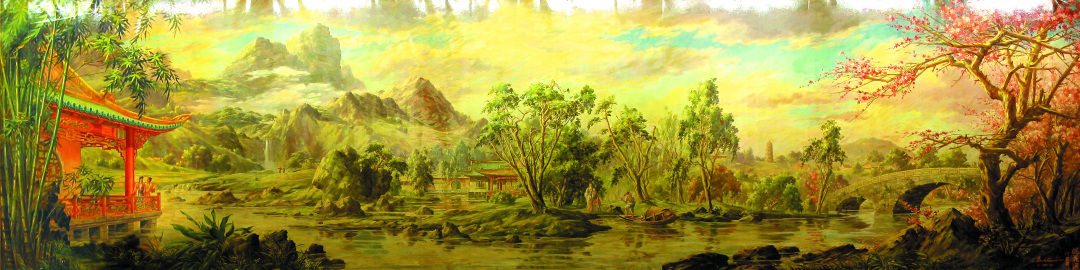 在宝庆一号艺术空间的二楼,醒目位置展示着一幅《世外桃源》画作的复制件。空间的主理人之一、何碧溪之孙何慧华告诉记者,这幅画是当年何碧溪在檀香山时创作的,是为当地最著名的华人餐馆“留余斋”的主宴会厅创作的。何碧溪以“桃花源”的主题入画,创造性地将传统文化中的山林意境和追求和平富足的精神用油画的手法加以表现,令当地的人们大感新奇。之后,他以类似的手法创作了多件中国主题的油画画作,为中华文化在当地的传播做出了自己的努力。