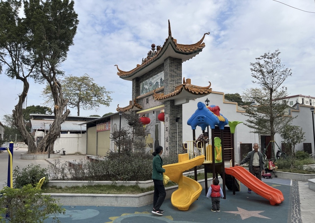 公园的后面是赤岗村党群服务中心,侧边是一座广州市传统风貌建筑“赤岗玉虚宫”,村民带小朋友来这里玩耍。有村民表示,建成了小公园,环境大变样,不仅可以在这里休息聊天,还可以带孩子玩。