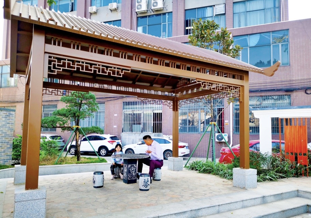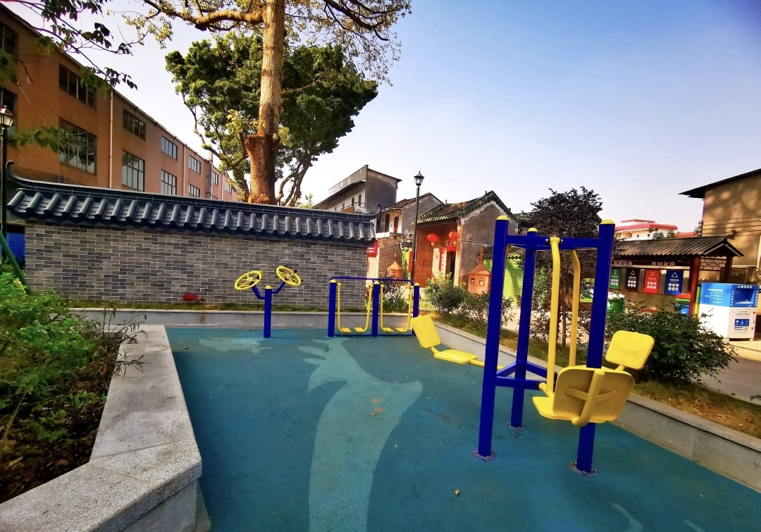 最近,在广州市番禺区石楼镇赤岗村牌坊前,一处破旧的简易铁皮棚已消失不见,取而代之的是一座漂亮的小公园,成了村民休闲健身的地方。