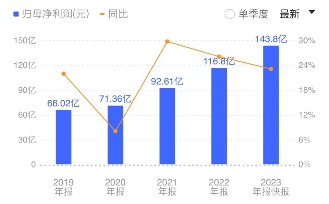 从盈利情况来看,2023年全年,该行实现营业收入350.16亿元,较上年同期增长6.33%;实现归属于上市公司股东的净利润143.83亿元,较上年同期增长23.15%。