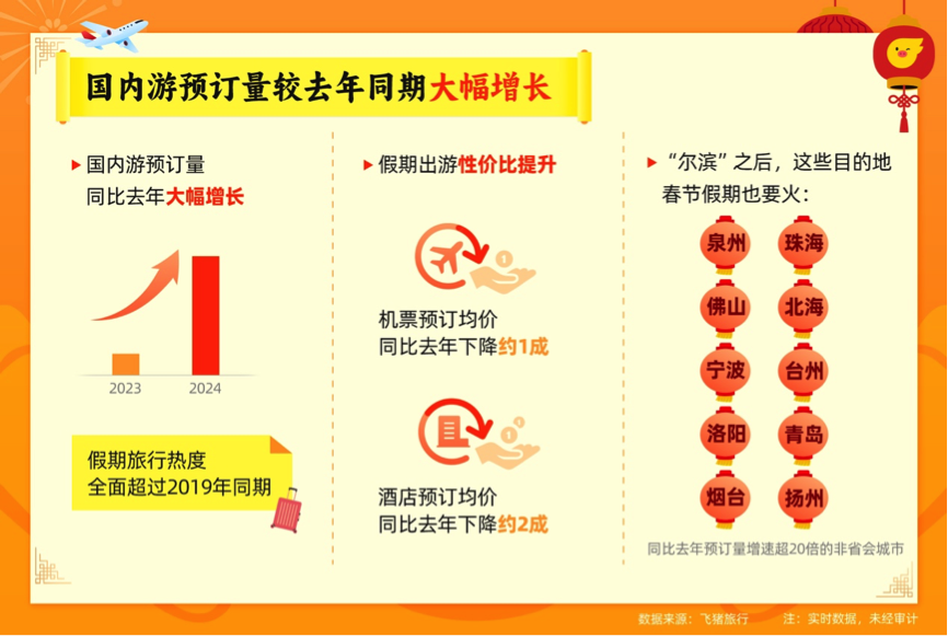 除经典的旅游目的地“劲旅”外,一众“尔滨”们也有望在春节假期脱颖而出。飞猪数据显示,泉州、珠海、佛山、北海、洛阳、宁波、台州、青岛、烟台、扬州等非省会城市的假期旅行预订量同比增速均超过20倍,或将成为春节档黑马。