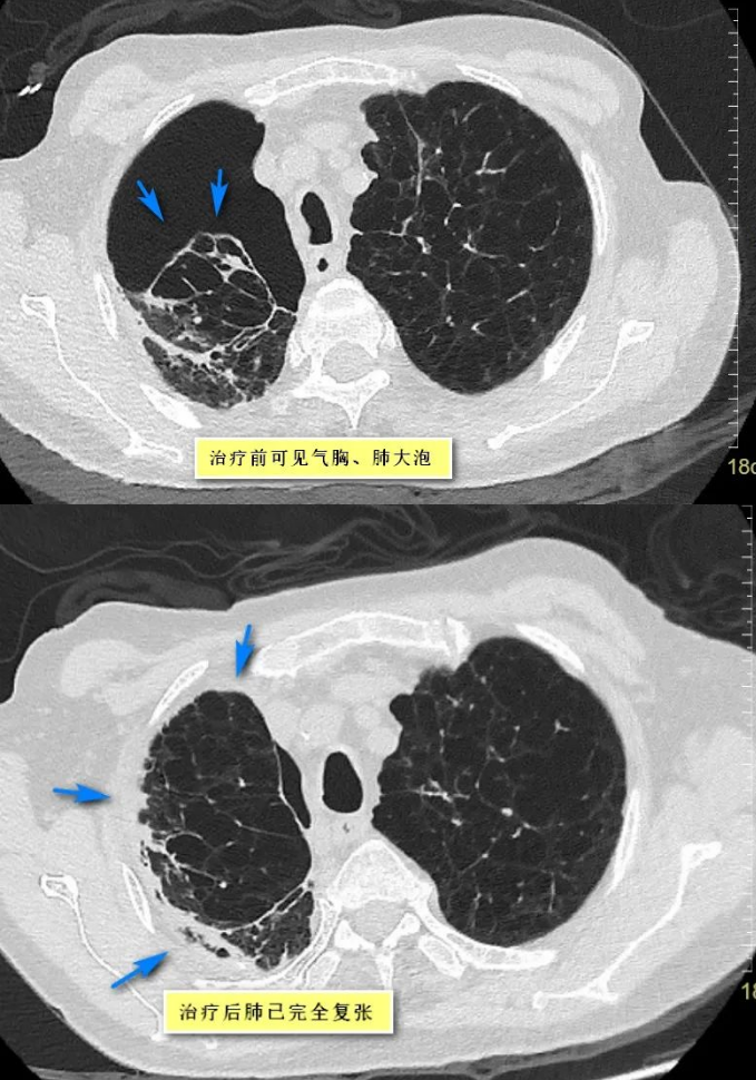 目前可选的气胸治疗手段有胸腔闭式引流、胸膜固定术、气管镜下介入治疗、胸腔镜手术或开胸手术等。然而,考虑到慢阻肺患者的肺功能很差,麻醉和手术风险高,治疗难度大。
