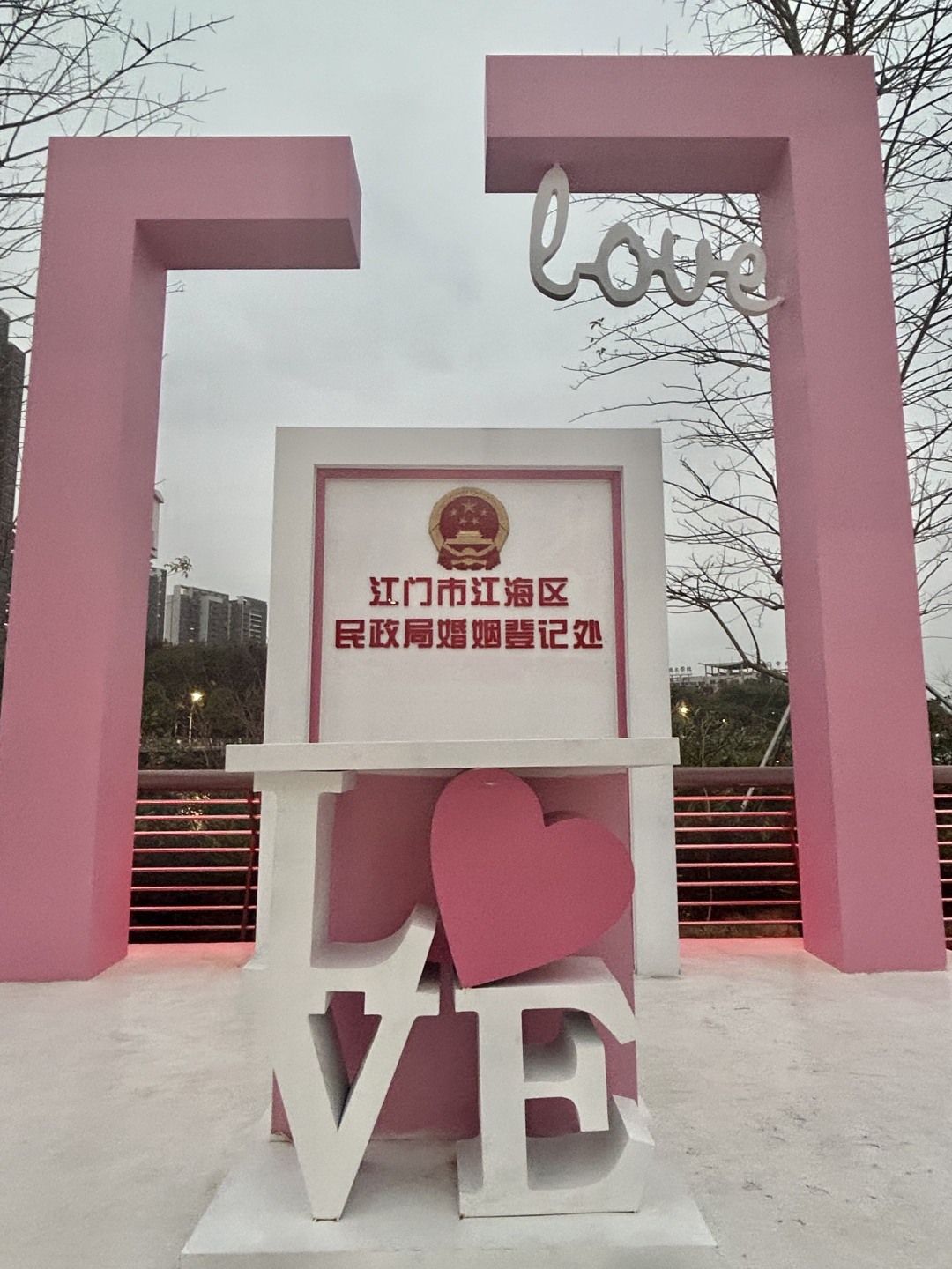 油湾公园沿江而建,自2023年1月启用以来,已经成为市民游客休闲娱乐的好去处。为进一步提升婚姻登记工作水平和服务能力,江海区民政局婚姻登记处重新选址,从江海区新中大道32号搬迁至油湾公园,并按照国家5A级婚姻登记机关评定标准进行建设,将婚姻登记服务与特色婚俗文化、时尚公园景观有机融合,推动婚姻登记环境从“标准化”走向“特色化”,从“办公程序化”走向“生态美学化”。