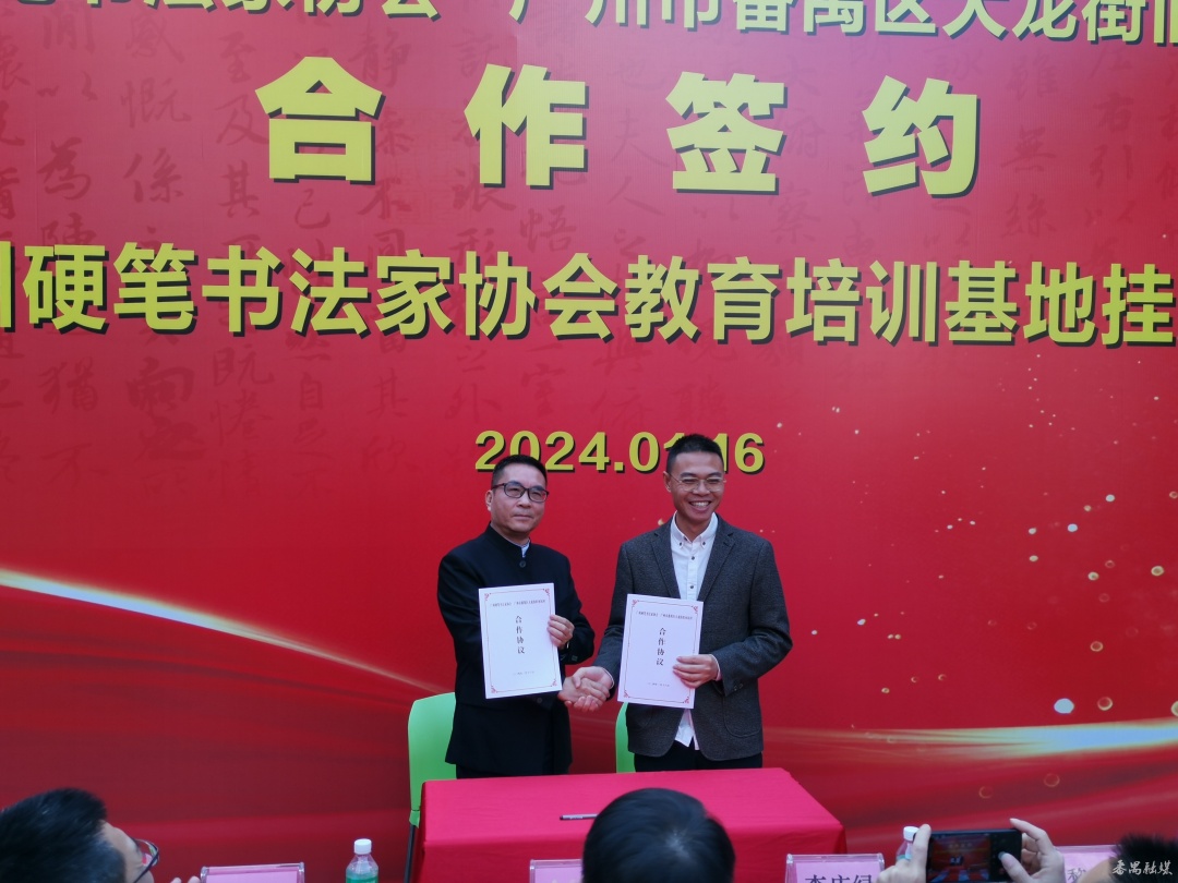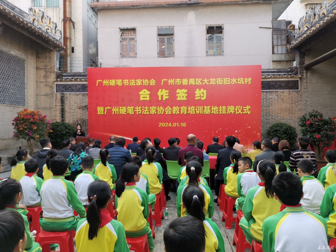 1月16日上午,广州硬笔书法家协会与番禺大龙街旧水坑村合作签约暨广州硬笔书法家协会教育培训基地挂牌仪式在大龙街旧水坑村陈尚书祠举行,双方将用两年左右的时间,把旧水坑村打造成为首个“广州写字教育示范村”。中国硬笔书法协会、广东省硬笔书法协会、番禺区文联、番禺区教育局、大龙街党工委、石碁教育指导中心、大龙街商会、旧水坑村等相关单位机构领导、嘉宾参加了挂牌仪式。