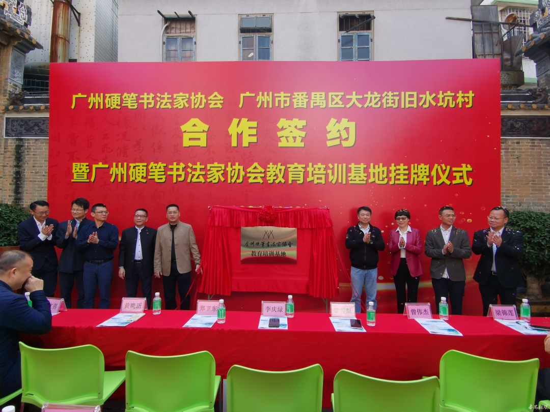 仪式上,广州硬笔书法家协会主席黎兴华与旧水坑村党委书记陈炯良进行合作签约;领导嘉宾共同为广州硬笔书法家协会教育培训基地挂牌揭幕。