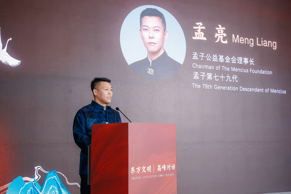 Meng Liang, chair of the Mencius Foundation and the 79th-generation descendant of Mencius, speaks at the second edition of Oriental Civilization Summit Dialogue in Shenzhen, South China's Guangdong province, on Jan 13, 2024. [Photo provided to chinadaily.com.cn]