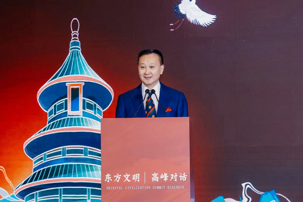Kong Zhong, vice chair of the World Federation of Confucius' Descendants and the 78th-generation descendant of Confucius, speaks at the second edition of Oriental Civilization Summit Dialogue in Shenzhen, South China's Guangdong province, on Jan 13, 2024. [Photo provided to chinadaily.com.cn]