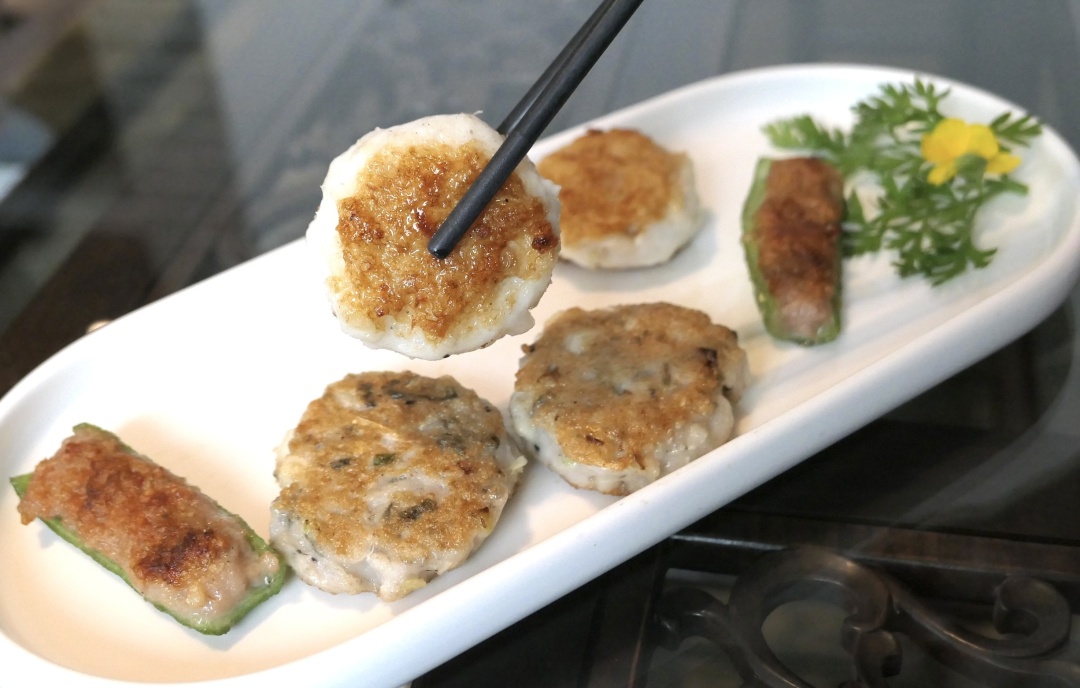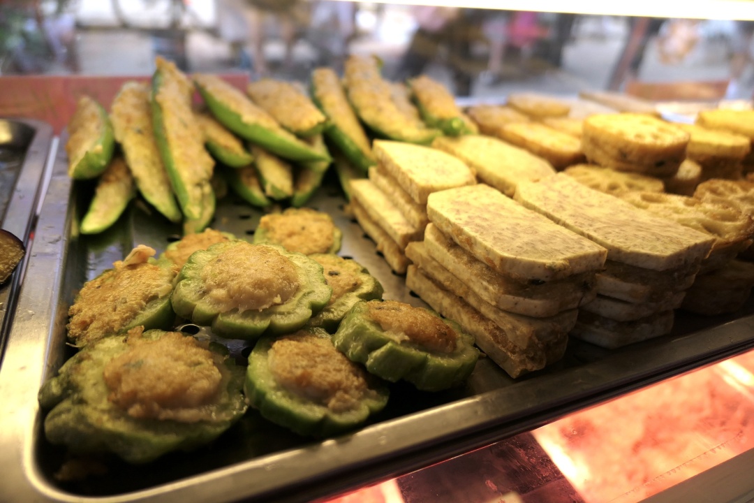 如今,煎酿三宝不再局限于青椒、苦瓜和茄子,图为煎酿青椒、莲藕和鲮鱼饼组成的煎酿三宝。