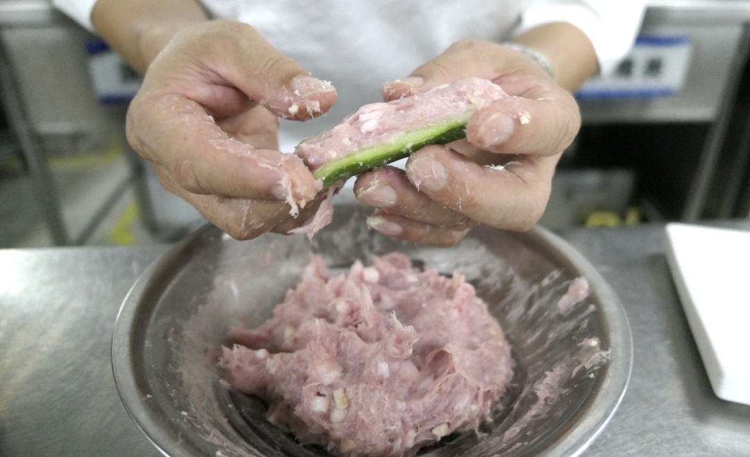 在制作煎酿三宝时,辣椒的长度、莲藕的大小、鱼胶的重量都有讲究。考虑到现在的人不喜欢吃太多肉,酒楼以尖椒代替圆椒制作煎酿。“选取8厘米长的尖椒酿肉,一来菜品更精致,二来也更健康。”张师傅介绍说。