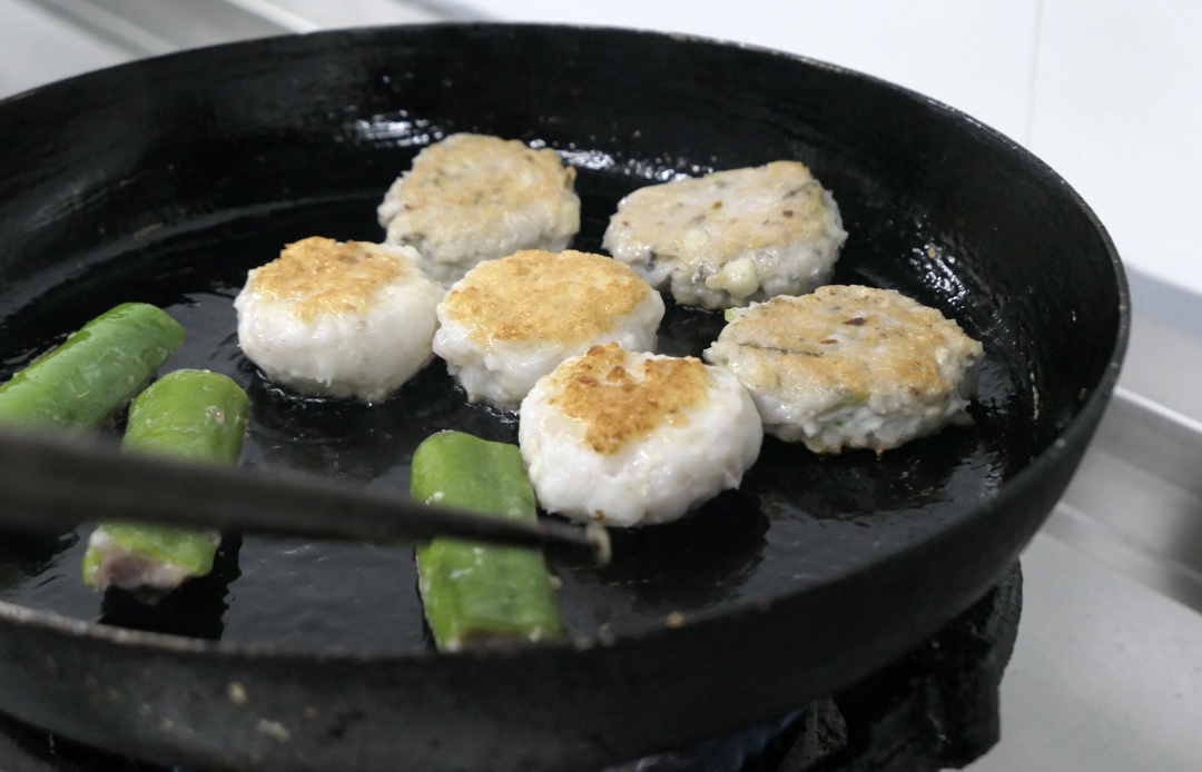在档口前热情招呼顾客的是老板娘容姐。忙着招呼客人的同时,她不忘探头查看厨房油锅里的酿辣椒和煎鱼饼是否够时间出锅;而在炉头旁忙着搅拌鲮鱼滑、打鲮鱼胶、煎鲮鱼饼的,则是老板寿哥。常来堑口菜市场买菜的街坊都知道,容姐和寿哥在这里卖鲮鱼滑已经好多年了。“从2014年到现在,已经将近8年了。”容姐笑说。