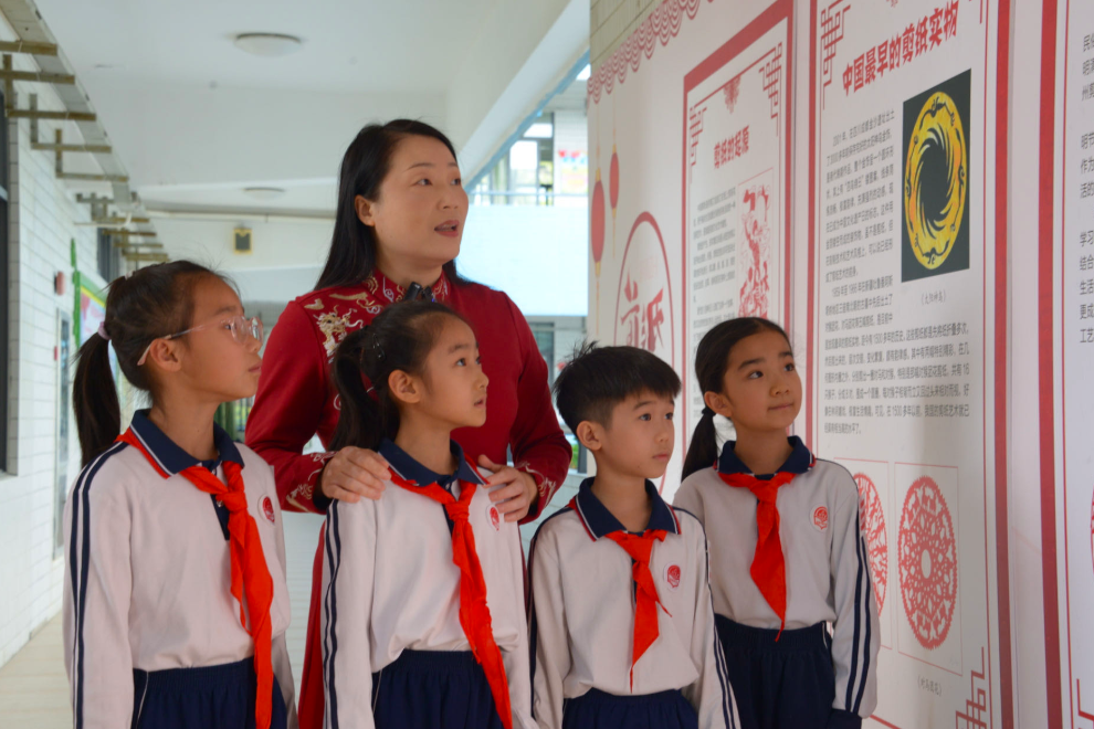 如今,学校建成了“非遗剪纸传习室”,在学校教学楼第三层的楼梯间和走廊都建成了广州剪纸知识展示区。走上这一层楼,就犹如进入了剪纸的世界,会被一幅幅精美的剪纸和生动的剪纸知识深深吸引。