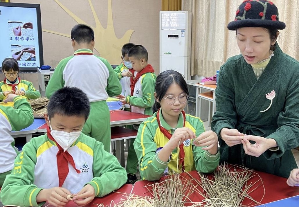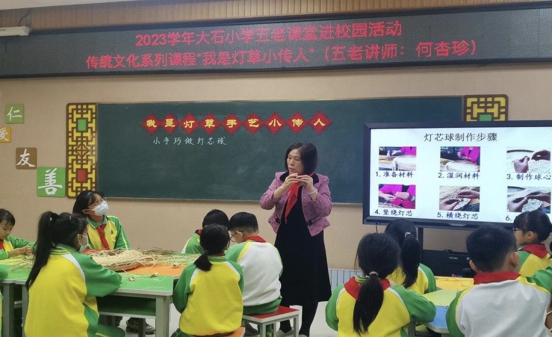 近日,广州市番禺区大石小学举行五老课堂进校园活动——传统文化系列课程“我是灯草小传人”,邀请番禺区级非物质文化遗产大石灯芯草制作工艺项目第三代传承人何杏珍授课。第四代传承人、大石小学教师范翠燕与学校“明心灯草社团”的“小传人”参加本次活动。