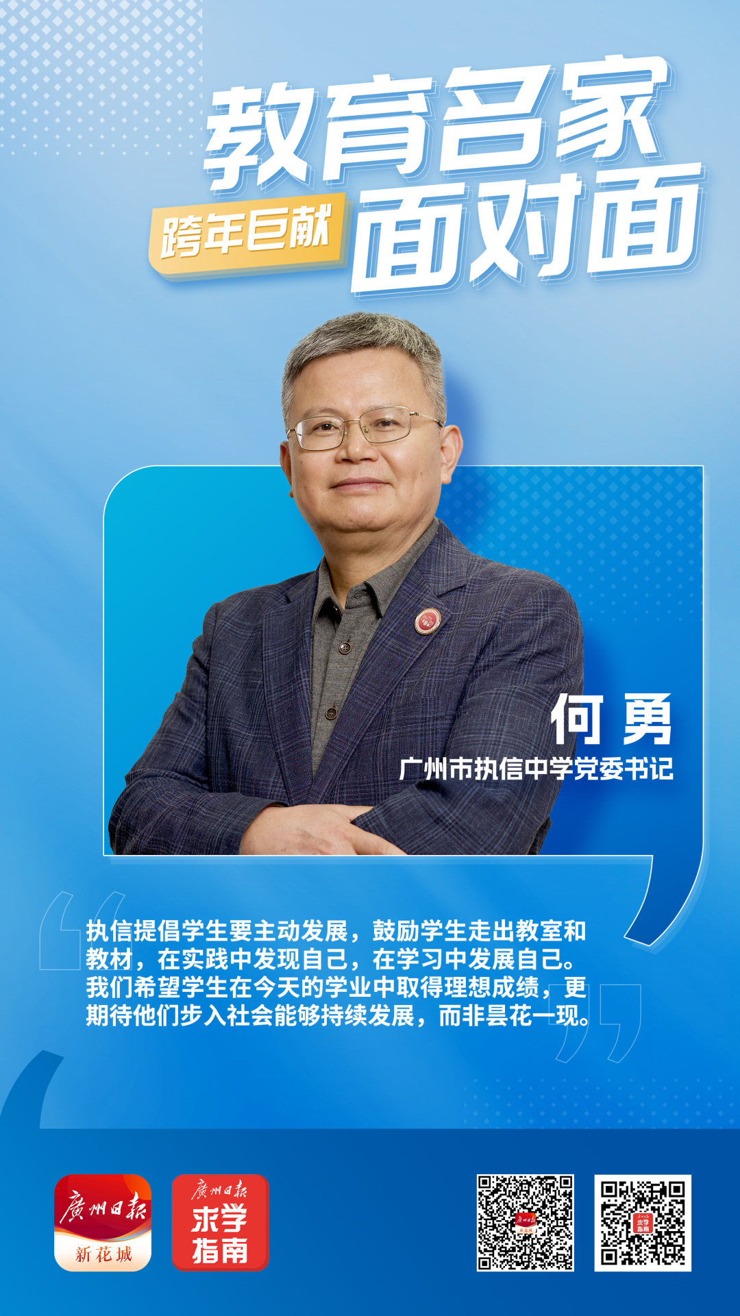 广州市执信中学党委书记何勇在接受广报求学《教育名家面对面》栏目专访时表示,“卷”不应该成为教育的主旋律,执信提倡学生要主动发展,学校希望学生在今天的中考高考当中能够取得优异成绩,更期待他们在未来的社会上可以实现持续发展,而非昙花一现。