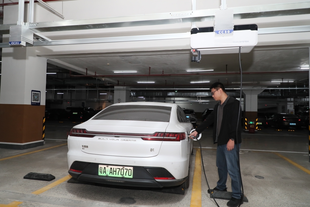 在地下停车场里,一条长约110米的银白色轨道贯穿60个停车位,一台共享充电机器人正在导轨上灵活穿行、辛勤“搬桩”。哪台车不够电就帮哪台车充,场面十分吸睛。