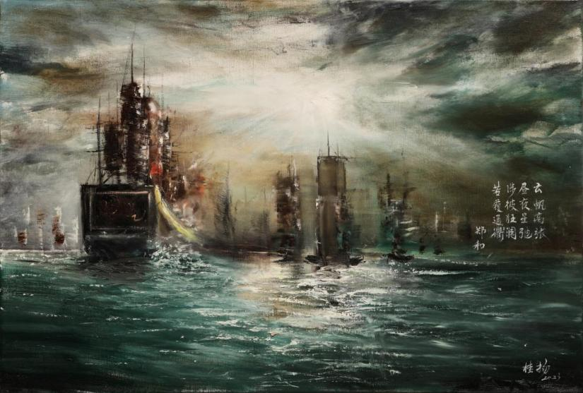 《海丝印象》系列画作紧贴时代脉搏,笔墨全部聚焦在海、帆、云、船、光,通过船在海中、船在岸边、船和岸上的商贸关系,以及海上丝绸之路沿途各地遗留下来的文化遗迹,把海丝文化的历史脉络梳理得非常清楚,充分展示了粤港澳大湾区的勃勃生机,表达了湾区文化的坚守和开拓。