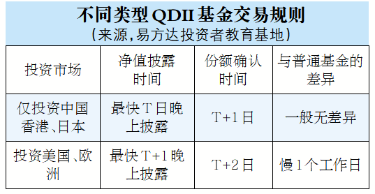 盈米基金研究员冯梓轩提到,对于QDII基金来说,投资者在T日交易时间内有效申购,T+2日确认,T+3日起可赎回;同样地,投资者在T日的赎回申请,在T+2日确认,T+10日内划款。费用方面,QDII的申赎费和普通基金没有太大的差别,但是管理费和托管费比较高,因此总费用可能会是一笔不小的开销。