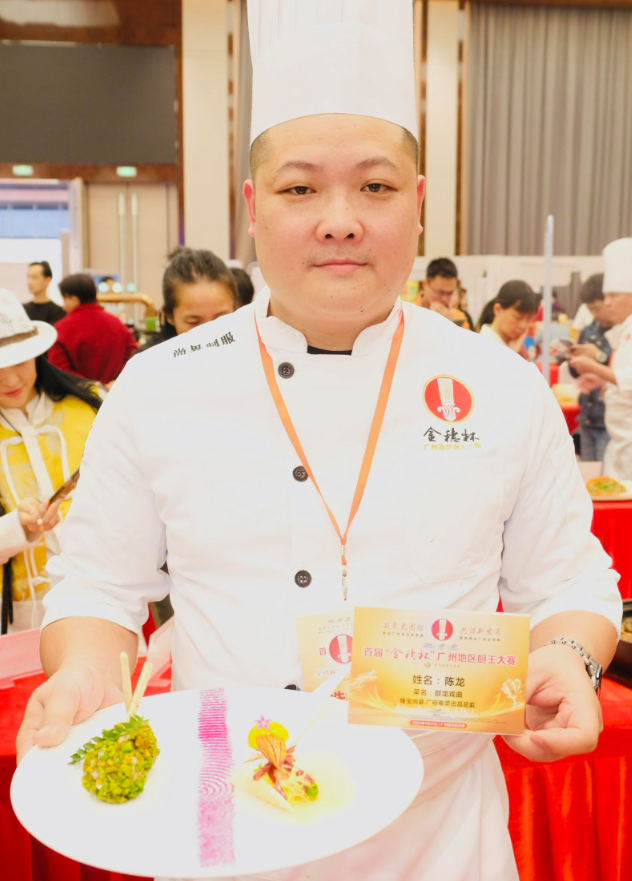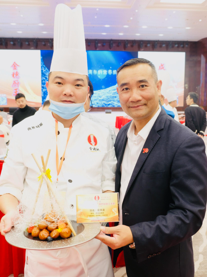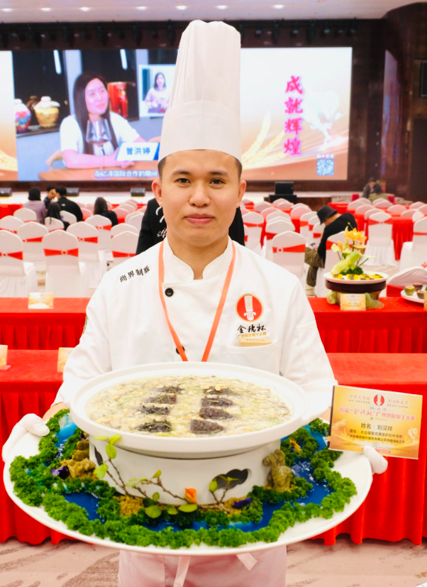 当天下午厨王比赛现场,入围的36位参赛选手带来的美食作品大放异彩。最终,荣获首届“金穗杯”广州地区厨王争霸赛的六大厨王分别为:马径敏(作品为龙腾四海、五彩海参)、官华波(作品为怀旧咕噜肉、榄角牛肉烧百花酿海参)、郭光伟(作品为藤椒鲜鲍生焗乳鸽、名鲜石斛鸡头米煮萨哈林海参)、陈龙(作品为群龙戏曲、竹炭烧萨哈林有米海参)、刘汉祥(作品为独占鳌头松子鱼、水边屋鱼茸羹烩萨哈林海参)、祝诗兵(作品为黑松露豆腐石榴球、萨哈林海参护国羹)。大赛组委会主席秦鉴洪和“中华厨王”卢锦泉为他们颁发奖杯和证书。