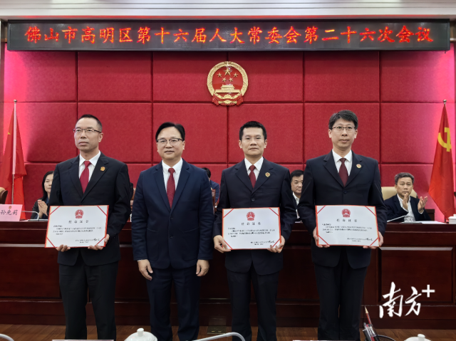 高明区人大常委会主任谭应佳(左二)为徐继真(左一)、黄海健(左三)、杨振华(左四)颁发当选证书。朱苏娇 摄