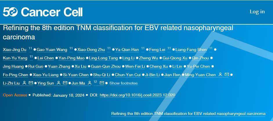 1月19日,中山大学肿瘤防治中心(以下简称“中肿”)发布消息称,由中国科学院院士、中肿副主任、常务副院长马骏领衔,中山大学肿瘤防治中心孙颖、刘立志、陈明远团队的鼻咽癌研究成果“EBV相关鼻咽癌第八版TNM临床分期修订”,于1月18日在线发表于国际顶尖肿瘤学期刊《癌症细胞》(Cancer Cell)。
