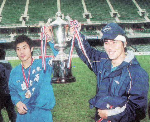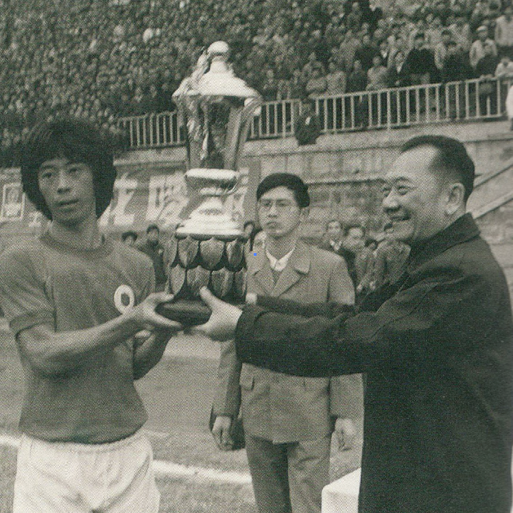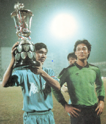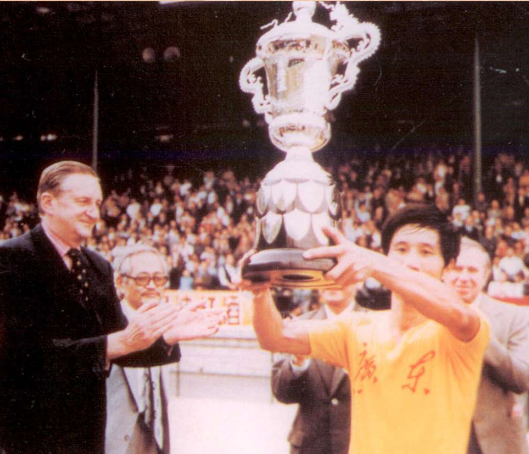 第10届省港杯,广东队队长池明华捧杯,门将(右)为孔国贤。