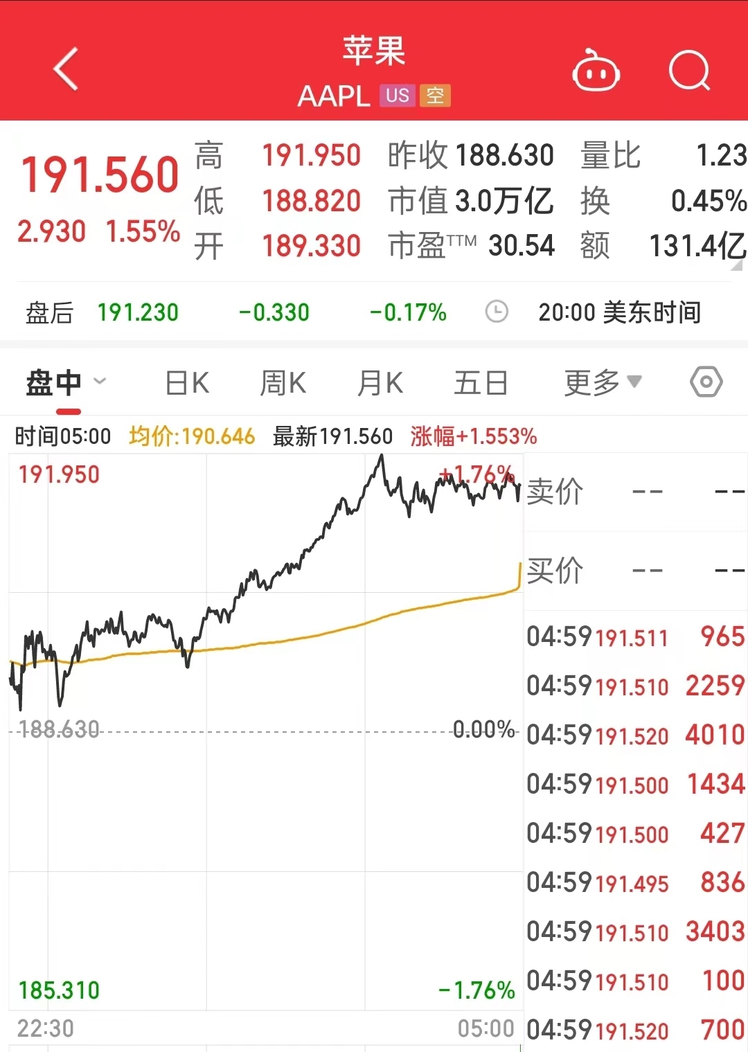 记者注意到,得益于Apple Vision Pro的良好开端表现,苹果的股价在周五的交易中也是上涨1.55%,重回190美元之上。