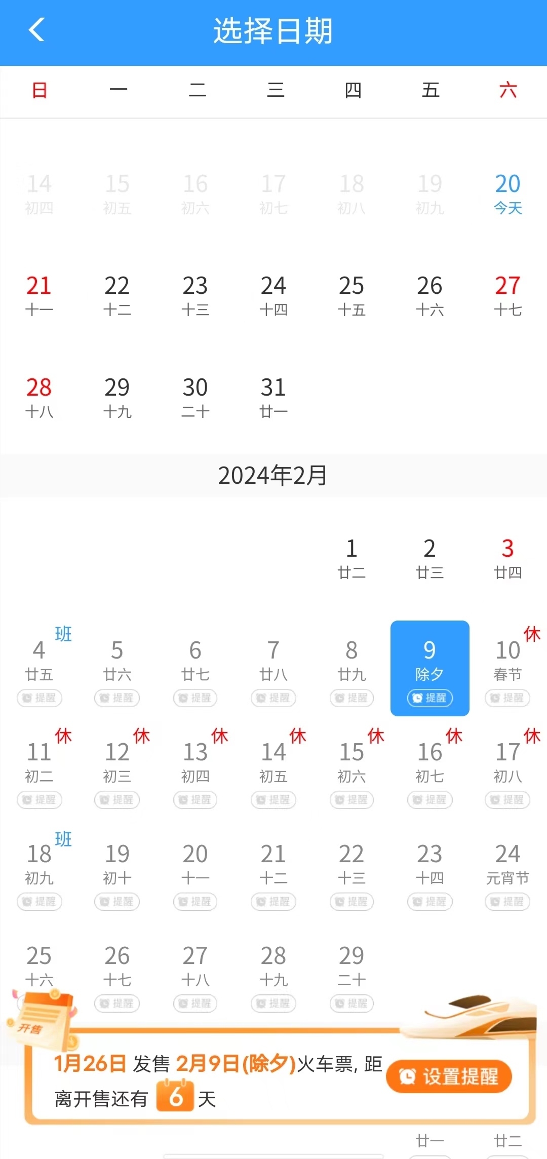 今日是1月20日,铁路部门开售南方小年(2月3日,年廿四)火车票。年廿八(2月7日)火车票1月24日开售,年廿九(2月8日)火车票1月25日开售,除夕(2月9日)火车票将于1月26日开售。同时,1月26日,一年一度的春运大幕也将正式开启。