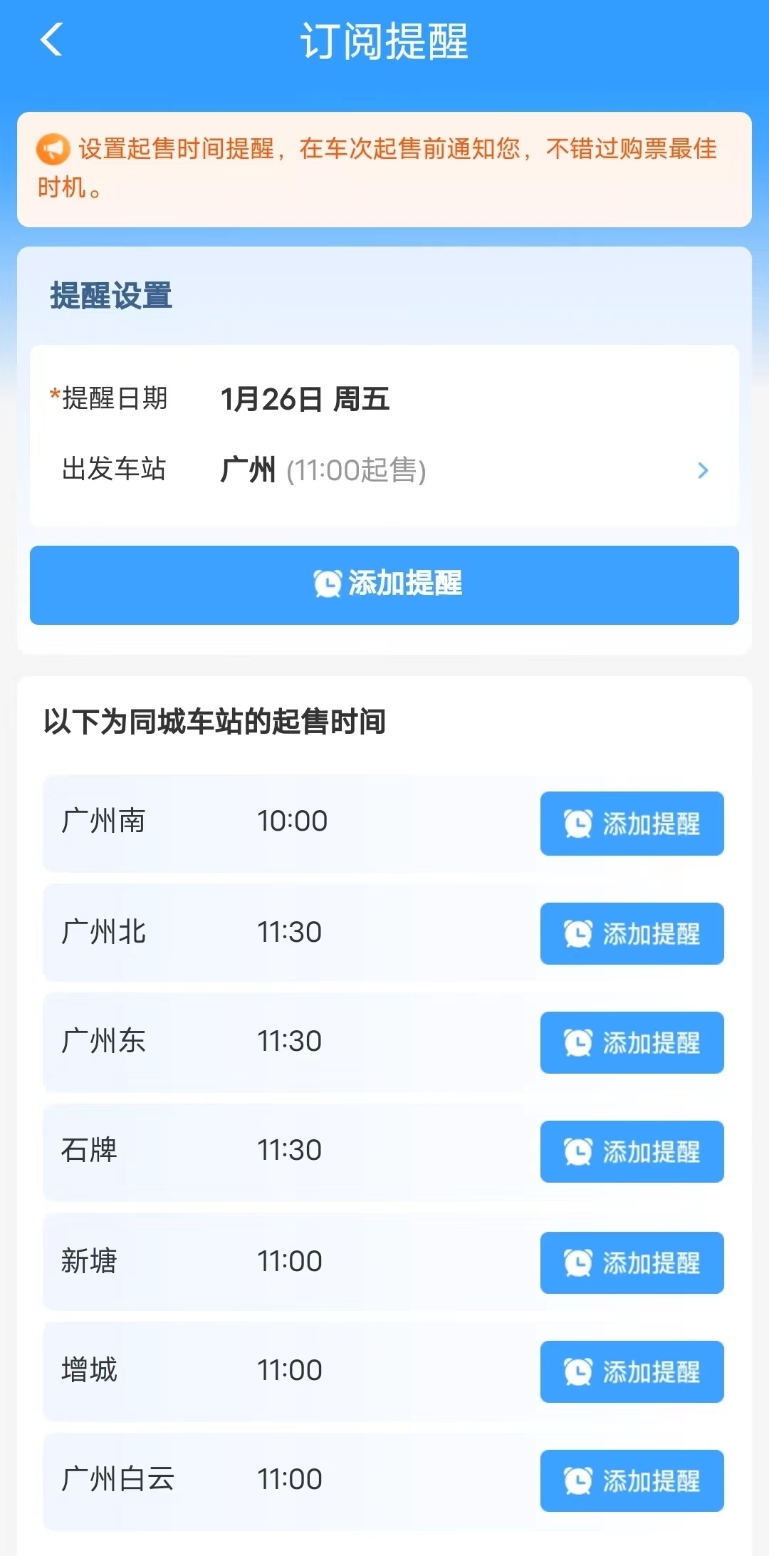 3.选择“出发车站”,也可根据需要选择“同城车站起售时间”,点击“添加提醒”。