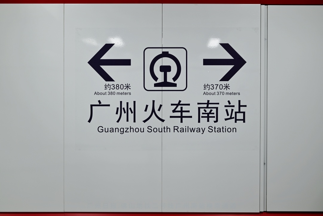 1月20日,记者搭乘佛山地铁2号线来到广州南站站点后,准备通过佛山地铁2号线广州南站换乘通道前往换乘广州地铁2号线。这个换乘通道有两种不同的设计风格,与佛山地铁2号线相连的一段,保留了佛山地铁2号线红白相间的简约风,转入通道拐角后,便是广州地铁颇具时尚新潮的黄色设计元素。该换乘的通道上,还有一个特别的提示,告知乘客广州南站在前方380米处。